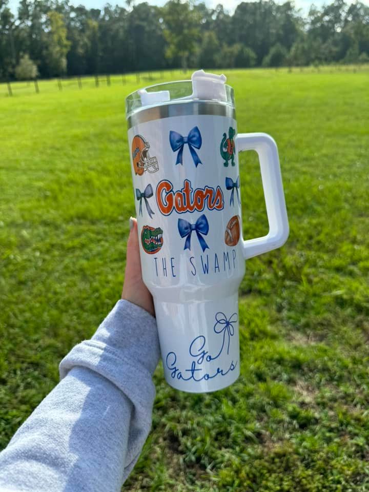This 40 oz Florida Gators tumbler features sublimated stainless steel construction and insulation to keep beverages at the perfect temperature. It includes a convenient straw for easy sipping, making it ideal for game days or daily use. For personalized designs or custom orders, please reach out to us directly. Gators!