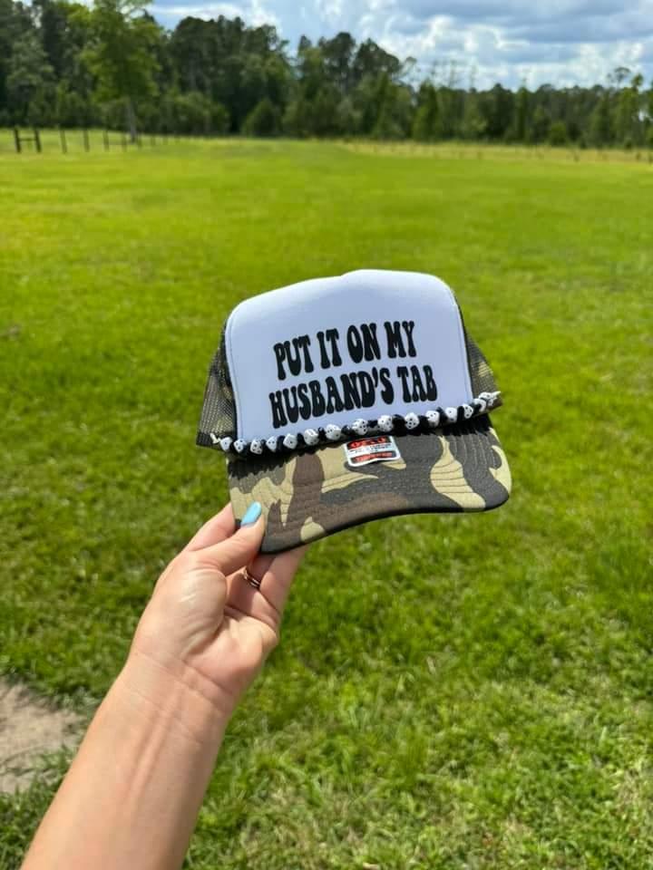 Introducing the "Put It On My Husband's Tab" hat - make a statement and wear it proudly, whether it's true or not. Our one of a kind hat is sure to turn heads.