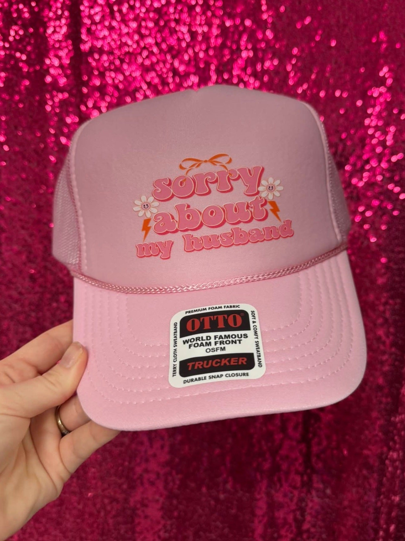 Add a playful, feminine flair to the bestselling viral "Sorry About My Husband" hat. Perfect for making a statement with style, this hat balances humor and charm effortlessly. Wholesale options are available for retailers looking to stock this popular item. Looking for a color that suits your vibe? Just send us a quick message, and we'll help you find the perfect shade to match your personality or brand.